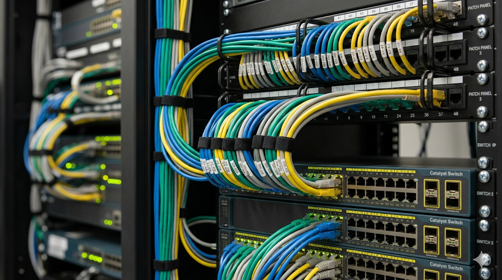 кабельная инфраструктура – патч-панели для коммутации оптоволокна, а также органайзеры и системы кабельного менеджмента (Cable Management System), обеспечивают порядок, удобный доступ к оборудованию и снижение рисков повреждения кабелей;