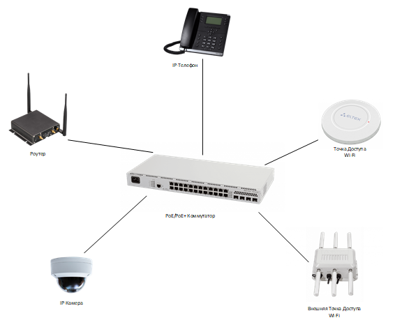 Источником PoE/PoE+ могут являться инжекторы-PoE или коммутаторы, поддерживающие эту технологию. Таким оборудованием являются коммутаторы производителя Eltex, вся линейка поддерживает стандарты IEEE 802.3 af/at, большой бюджет PoЕ позволяет подаваться на каждый медный порт мощность 30 Вт, чем может похвастаться не каждый коммутатор из ныне существующих