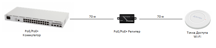 Согласно стандарту мощность питания, подаваемая от источника, гарантированно отдается потребителю на расстоянии до 100м, это достигается с помощью интеллектуальной схемы дистанционного питания, которая управляет значением питающего напряжения. На практике невозможно добиться идеальных условий, частые перегибы жиг, неравномерное сечение проводов, паразитное электромагнитное взаимодействие между парами увеличивают потери напряжения и дальность передачи снижается на 20-25%. В тех случаях, когда требуется питать оборудование, находящееся на большом расстоянии от источника, используют специальные PoE репитеры/удлинители, восстанавливающие амплитуду до номинального значения.
