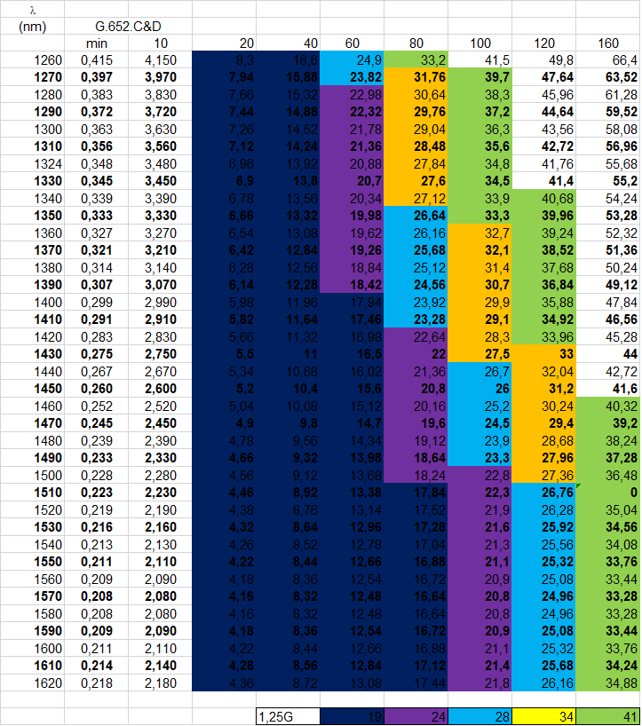 На таблице ниже приведен расчет затухания в оптическом волокне G.652 C&D для различных расстояний, и выбор соответствующих SFP модулей CWDM.